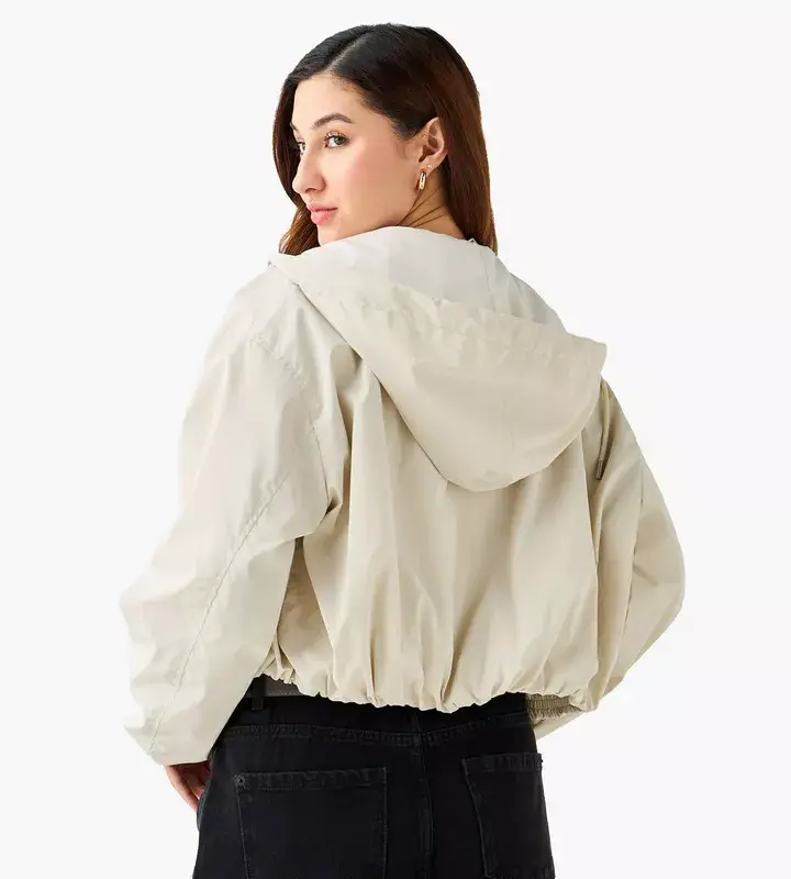 Hooded cropped jacket with a zip-front closure and adjustable drawstrings. Designed with a relaxed fit for easy layering. A modern essential for casual wear.